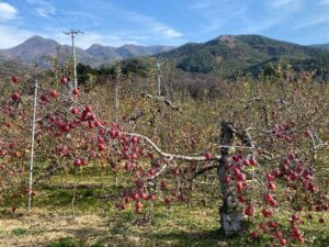 ブツブツ呟きながら歩いていると津金の林檎畑が見えて来た。シーズンも終盤を迎えほとんどの木々は収穫を終えている。私の働く果樹園の林檎と比べ丈が低いながら、赤い実は鈴なり状態だ。まあ、年季が違うのだろう。津金学校の売店で山盛り販売しているこの時期、県外からも多くの方が訪れる。抜ける様な青空・周辺の山々の紅葉・真っ赤に輝く林檎が描く津金キャンバスは南麓の原風景の一つだと思う。苦労して歩いてくるとこんなご褒美がある。時間と体力のある方は此処まで歩くことをお勧めします。
