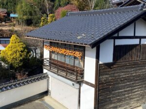 帰路は、軒先に干し柿をつるした古民家を見つけました。ほろ酔いで心が落ち着く素敵な散歩でした。