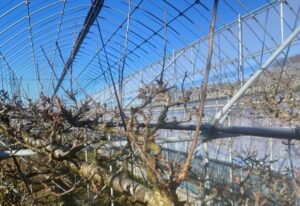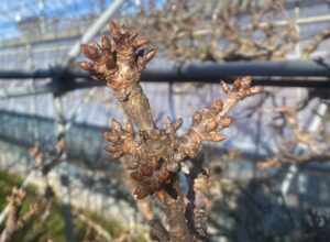 この時期は、①複芽(葉と花の芽の塊)の間引きと②新梢の切り取りの順番で剪定が行われる。間引きはプロの方が一本一本チェックして主枝(幹から出ている長い枝)当たり○○個を上限にと、我々に間引きの指示が出る。陽当たり、側枝(主枝から出ている小枝の塊)のバランス、収穫のし易さを勘案し間引いていく。私の短い経験からではあるが、①実が固まって生る所は陽当たりにむらが出来やすく、色合いもあまり良くないことが多い。②だからバランス良く枝ぶりを作っておくと綺麗で美味しそうな実に繋がる。③葉に覆われて陽当たりの悪いところはジメジメしカビも生える。④枝ぶりが伸び放題になっているととても収穫がしにくく作業が危ない、などが頭にしっかりと刻まれている。